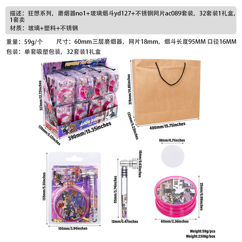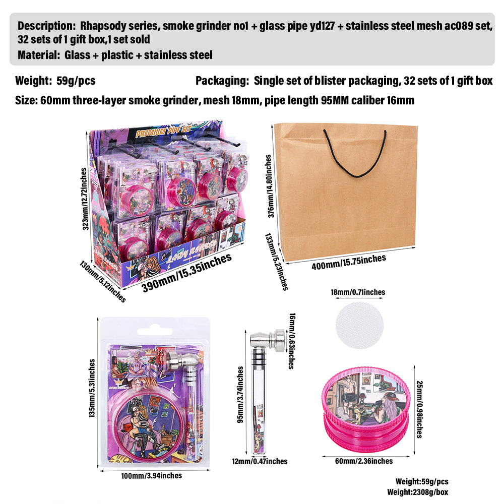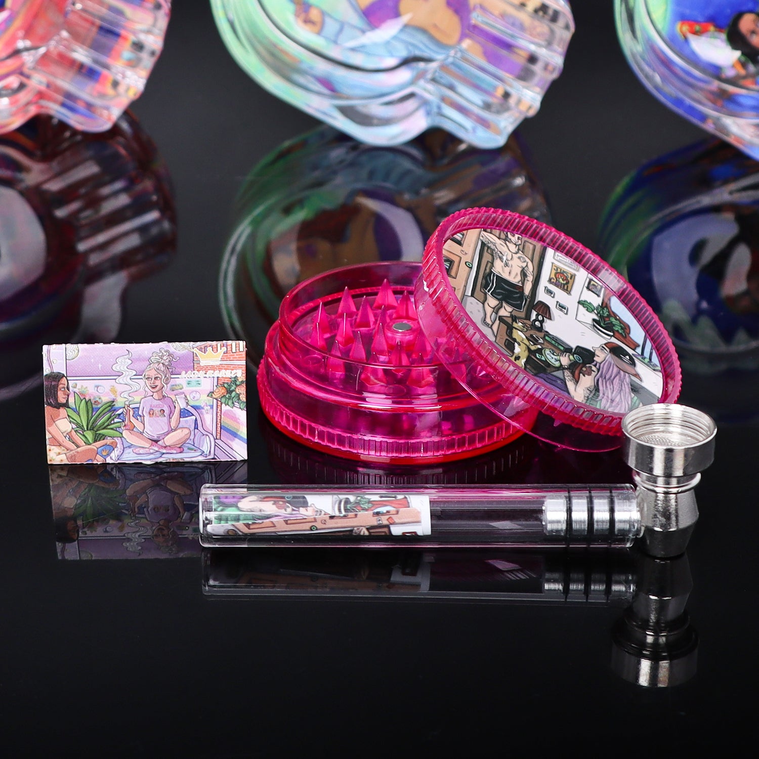 Hot Sale Complete Set Of Smoking Accessories Glass Pipe Material Including Plastic Grinder Set Of Smoking Accessories