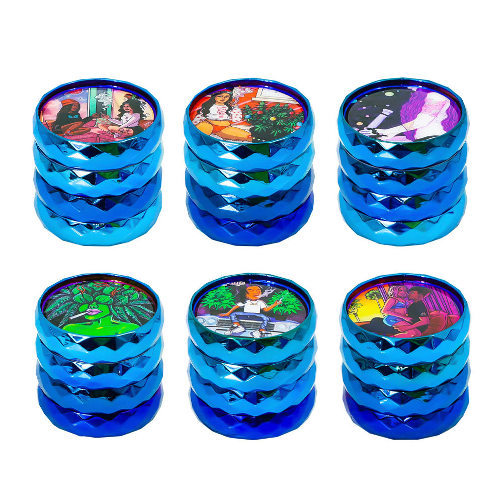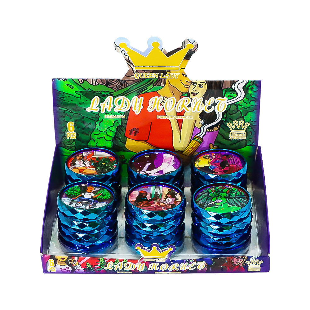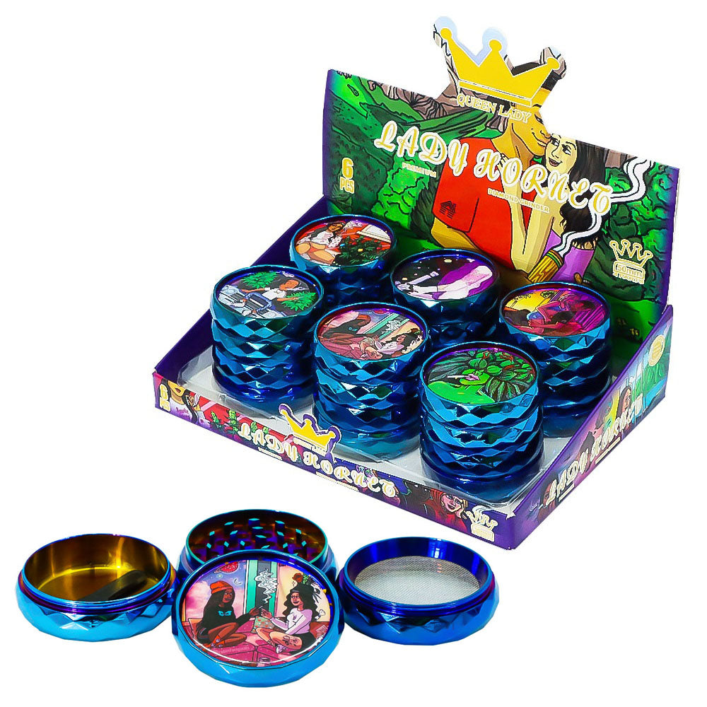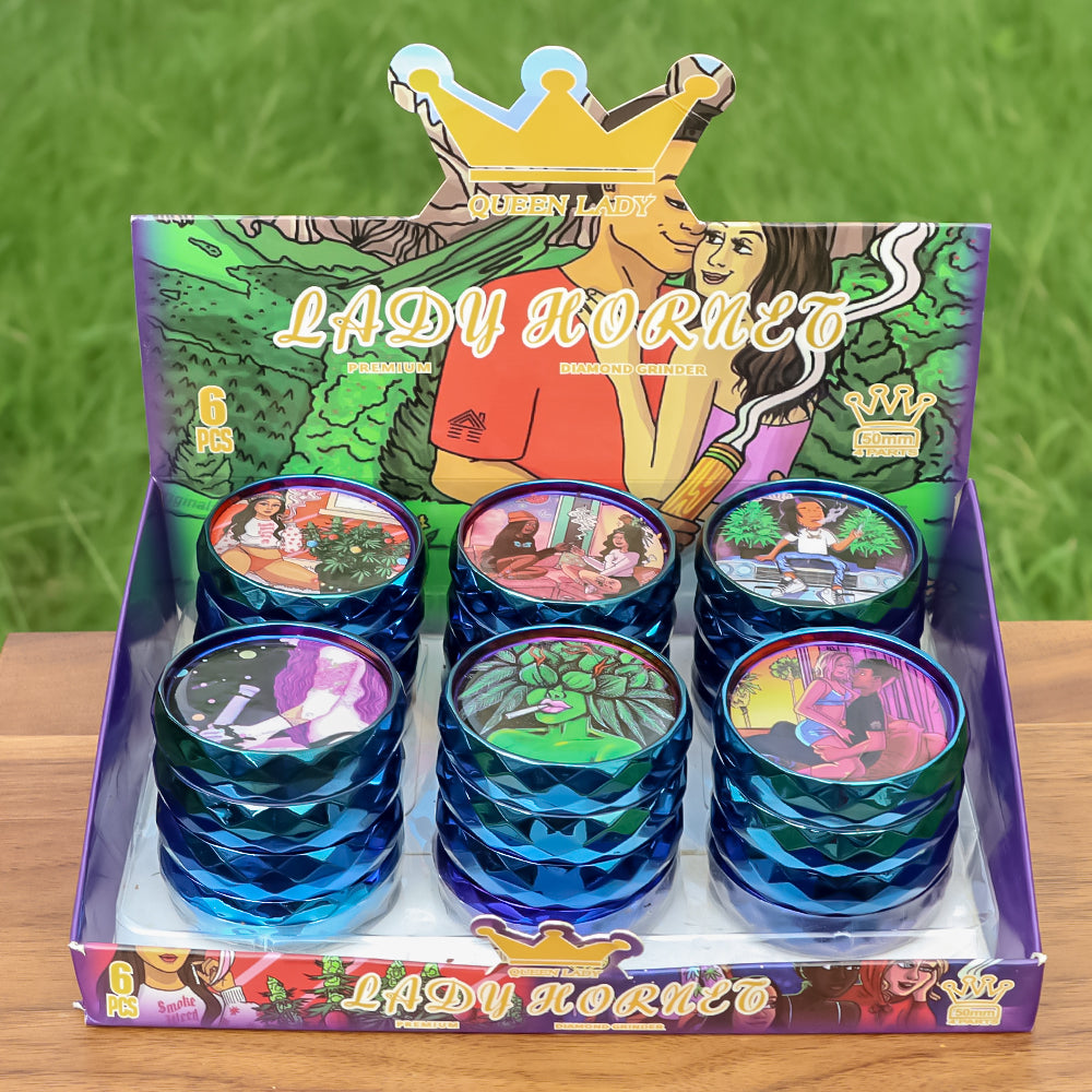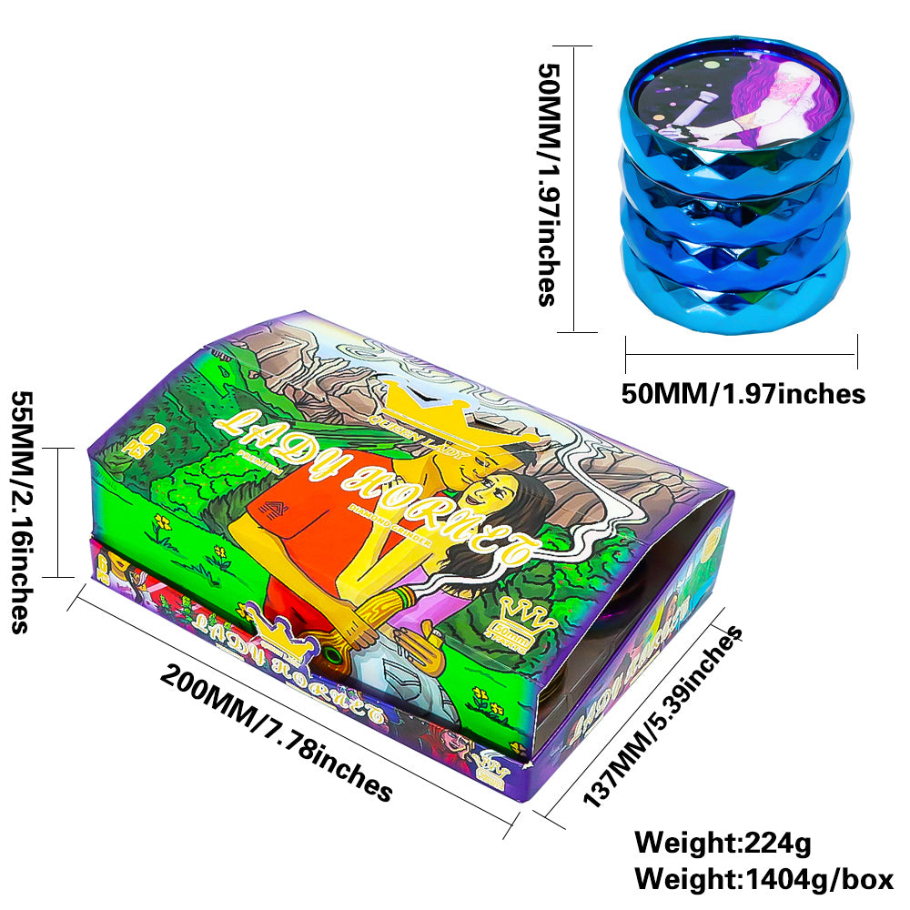 LADY HORNET Zinc Alloy Herb Grinder with Glass Lid, 4 Lay Ø 50 Smoker Grinder, Diamond Design Portable Tobacco Grinder, 12 PCS/ Box